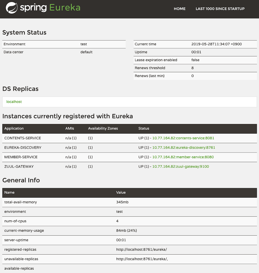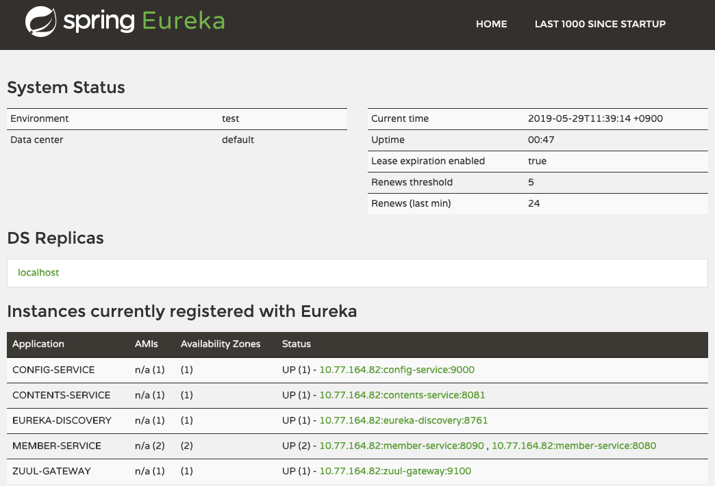 // member-service @EnableDiscoveryClient @SpringBootApplication public class MemberServiceApplication { ................. } // contents-service @EnableDiscoveryClient @SpringBootApplication public class ContentsServiceApplication { ................. } // zuul-gateway @EnableDiscoveryClient @EnableZuulProxy @SpringBootApplication public class GatewayApplication { ................. } |