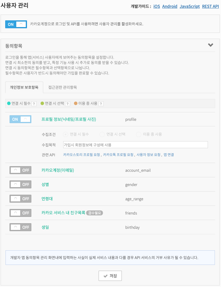 카카오 계정으로 로그인 및 API를 사용하려면 사용자 관리를 활성화합니다.