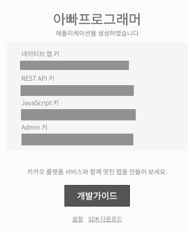 애플리케이션 생성 완료 화면입니다. 앱 키는 연동을 위해 복사해 놓습니다. (설정 – 일반에서 확인 가능)