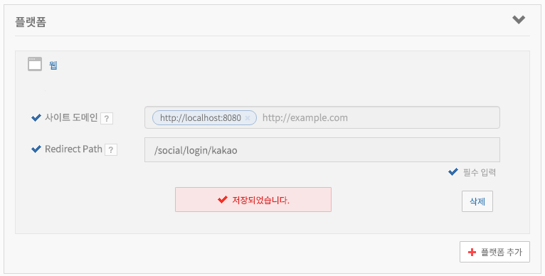 플랫폼 탭에 사이트 도메인이 등록된 것을 확인 가능합니다. RedirectPath는 카카오 로그인 연동 후 인증 성공시 Callback 받을 URL입니다. 다른 social 로그인과 연동 시 충돌 방지를 위해 적당한 path로 변경합니다.