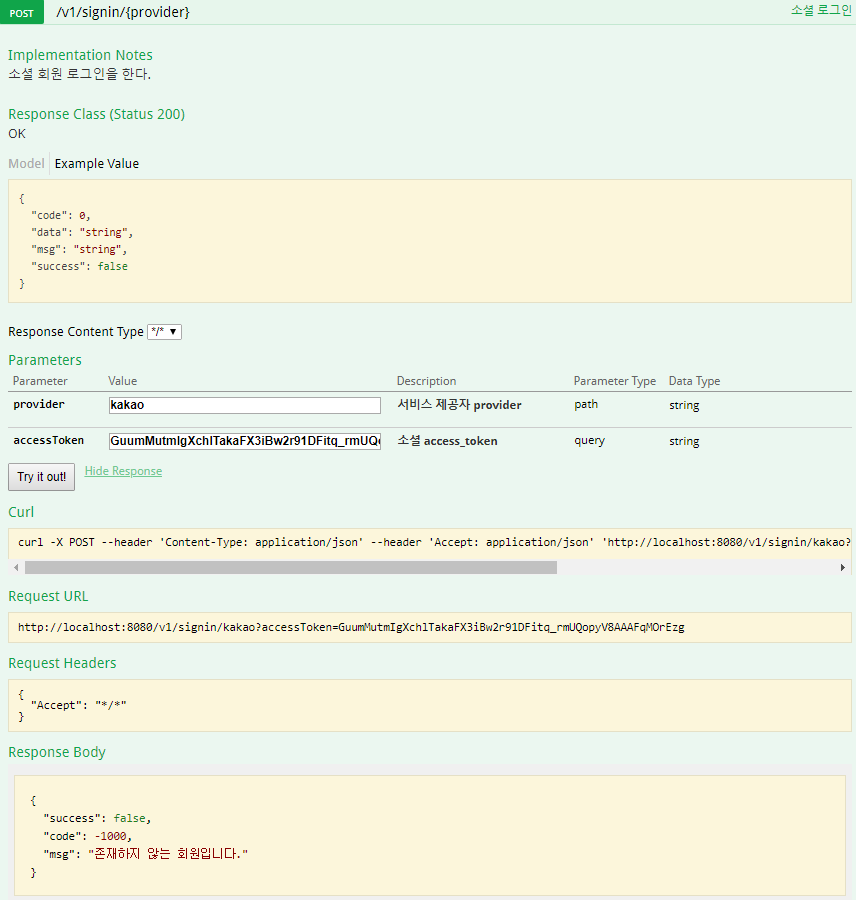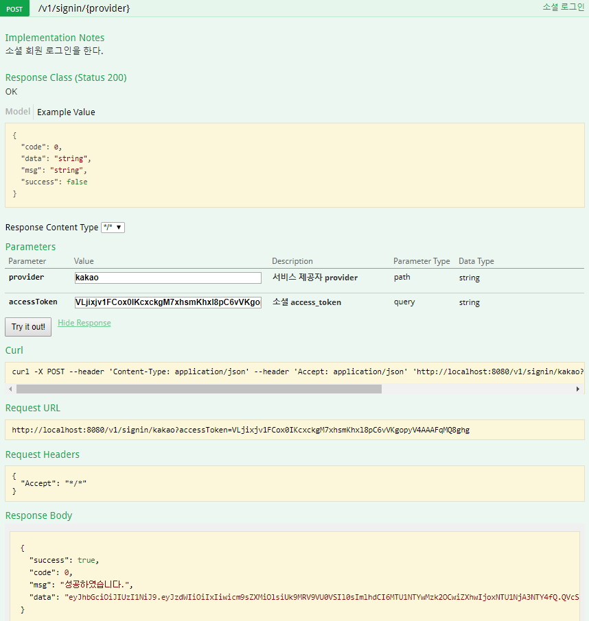 @ApiOperation(value = "소셜 로그인", notes = "소셜 회원 로그인을 한다.") @PostMapping(value = "/signin/{provider}") public SingleResult<String> signinByProvider( @ApiParam(value = "서비스 제공자 provider", required = true, defaultValue = "kakao") @PathVariable String provider, @ApiParam(value = "소셜 access_token", required = true) @RequestParam String accessToken) {