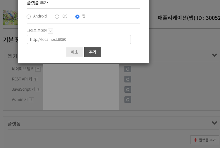 메뉴 – 설정 – 일반에 들어가 플랫폼을 추가합니다. 플랫폼은 웹을 선택합니다. 사이트 도메인은 로컬 PC에서 테스트할 것이므로 http://localhost:8080 을 입력합니다. 향후 서비스를 위한 도메인도 추가로 입력 가능합니다.