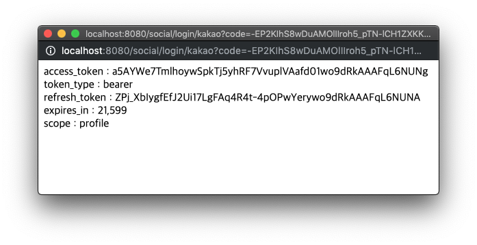 Controller에서 /social/login/kakao의 리소스를 처리하는 부분을 보면 파라미터로 전달된 code 정보로 카카오의 access_token을 얻는 api를 호출하는 것을 확인할 수 있습니다.