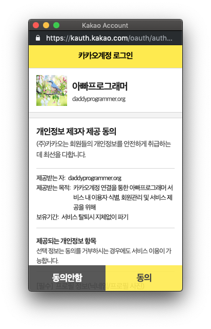- 카카오 로그인을 완료 시 앱 연동 화면이 나오고 동의를 통해 앱과 카카오 계정을 연결
