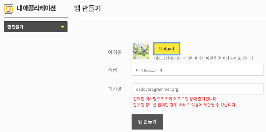 앱 만들기 화면에서 아이콘/이름/회사명을 적고 앱 만들기 클릭합니다.