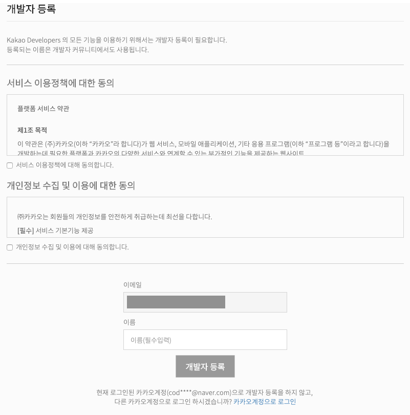 https://developers.kakao.com/ 사이트로 이동하여 카카오 ID로 로그인합니다. 개발자로 등록이 안되어 있으면 개발자로 등록합니다.