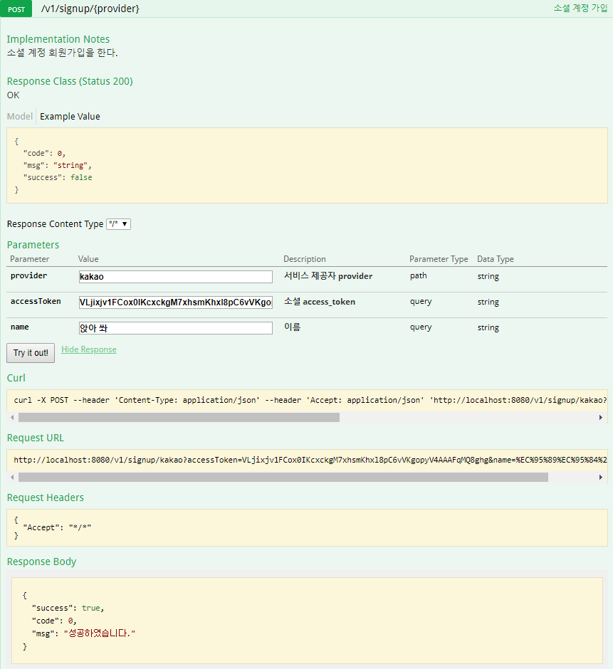@ApiOperation(value = "소셜 계정 가입", notes = "소셜 계정 회원가입을 한다.") @PostMapping(value = "/signup/{provider}") public CommonResult signupProvider(@ApiParam(value = "서비스 제공자 provider", required = true, defaultValue = "kakao") @PathVariable String provider, @ApiParam(value = "소셜 access_token", required = true) @RequestParam String accessToken, @ApiParam(value = "이름", required = true) @RequestParam String name) {