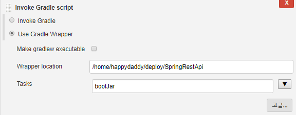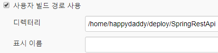 고급 – 사용자 빌드 경로 사용 체크를 하고 빌드할 디렉터리를 입력합니다. 디렉터리는 입맛에 맞게 설정하시면 되고, 여기서는 계정 홈 deploy 디렉터리가 배포의 base 디렉터리이며 하위의 SpringRestApi 디렉터리에 Git 프로젝트가 clone되도록 하겠습니다.
