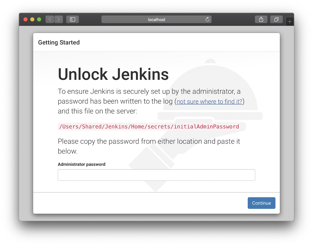 $ sudo cat /Users/Shared/Jenkins/Home/secrets/initialAdminPassword Password: c02e5269b6f54e0f9ec21eab5171a513 |