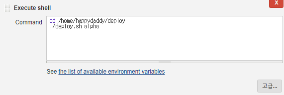 Add Build Step – Execute Shell을 선택하고 다음 내용을 입력합니다. 실제 배포를 진행하는 스크립트를 수행하는 명령입니다.