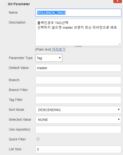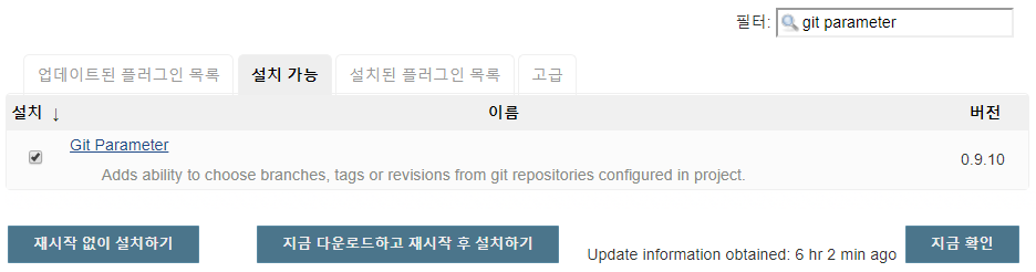 Git Parameter를 체크합니다. 선택에 없을경우엔 Jenkins관리 – 플러그인 관리 – Git Parameter를 검색 후 설치 한다음 Jenkins 서버를 restart합니다.