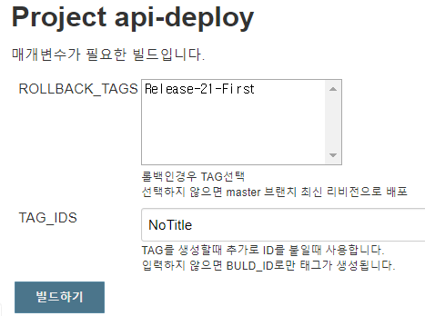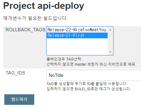 다시 Build with Parameters를 선택합니다. ROLLBACK_TAGS에서 이전에 배포한 내용의 TAG를 선택 할 수 있습니다.