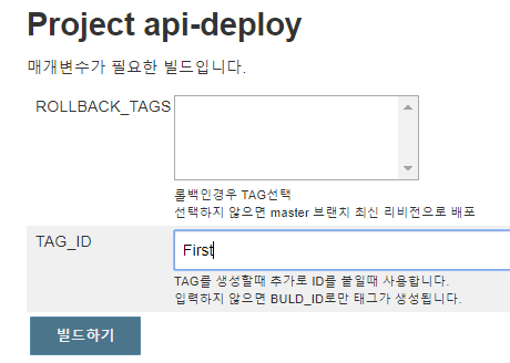 이전에는 Build Now를 누르면 바로 배포가 실행되었지만, 이제는 롤백할 TAG를 선택하거나 TAG_ID를 입력해서 빌드할 수 있도록 보여집니다. TAG_ID에 First라고 입력 후 배포를 수행해 봅니다.