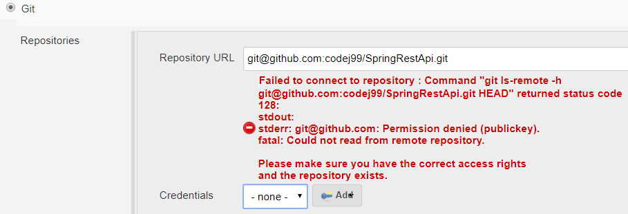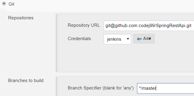 credentials 항목은 등록된 credentials가 없어서 none으로만 나오고 선택이 불가능합니다. add – Jenkins 선택하여 credentials를 추가합니다.