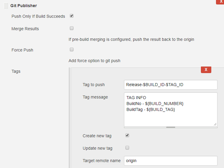 Git Publisher는 명칭 그대로 Git에 특정 작업을 수행할 수 있게 도와주는 플러그인입니다. 여기서는 배포 완료후에 해당 Git 프로젝트에 Tag를 만들어 Remote로 Push하기 위해 사용합니다.