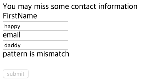 <form> <div ngModelGroup="contact" #contact=ngModelGroup> <div *ngIf="firstName.touched && email.touched && contact.invalid">You may miss some contact information</div> <label for="firstName">FirstName</label><br> <input required ngModel name="firstName" #firstName=ngModel> <div *ngIf="firstName.touched && !firstName.valid">Name field is required!</div> <br> <label for="email">email</label><br> <input required ngModel minlength="3" maxlength="20" pattern="^\w+([\.-]?\w+)*@\w+([\.-]?\w+)*(\.\w{2,3})+$" name="email" #email=ngModel> <div *ngIf="email.touched && !email.valid"> <div *ngIf="email.errors['required']">email is required</div> <div *ngIf="email.errors['minlength']">email should have at least 3 characters</div> <div *ngIf="email.errors['pattern']">pattern is mismatch</div> </div><br> <button [disabled]="contact.invalid">submit</button> </div> </form> |