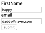 예제에서는 이름과 이메일을 입력받는데 둘중 하나의 입력값이 유효하지 않을경우 오류 메시지를 발생시키고 submit버튼을 비활성화 처리 합니다.