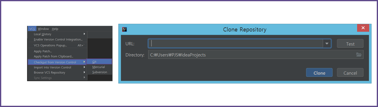 터미널에서 Clone을 실행할 수 있지만, IntelliJ에서 해보도록 하겠습니다.
