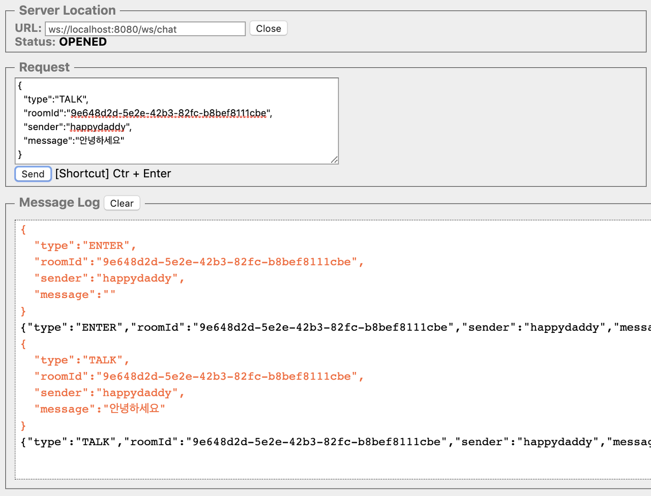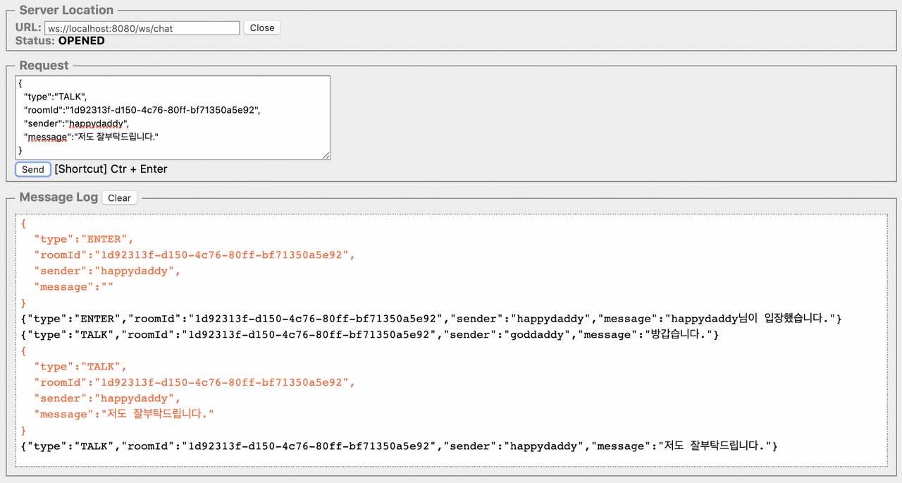 { "type":"TALK", "roomId":"9e648d2d-5e2e-42b3-82fc-b8bef8111cbe", "sender":"happydaddy", "message":"안녕하세요" } |