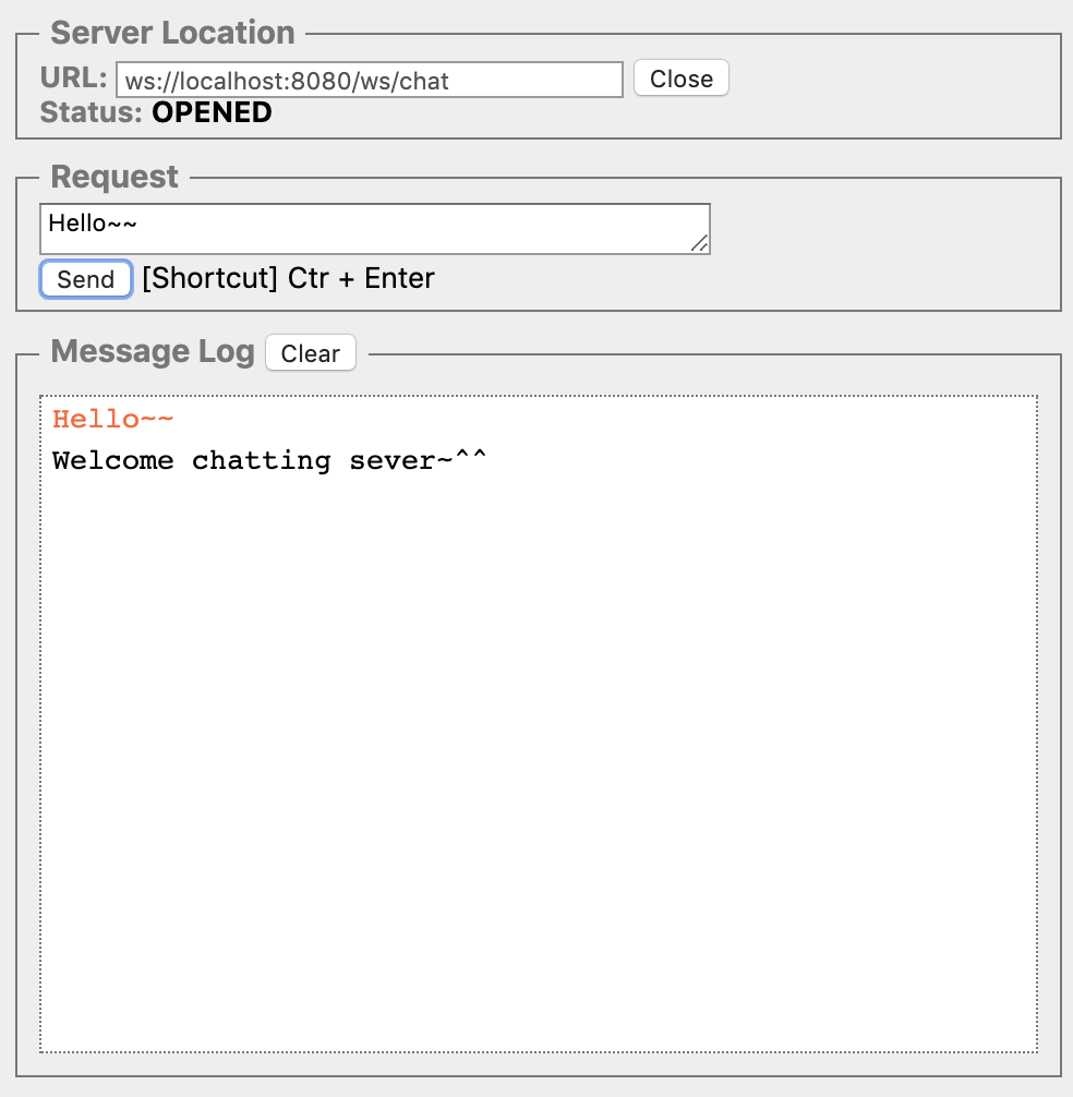 Chrome에서 Simple websocket을 실행하고 ws://localhost:8080/ws/chat에 연결합니다.