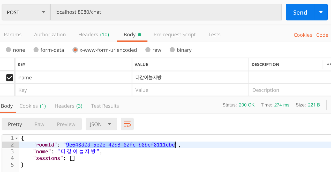 Postman으로 다음과 같이 채팅방을 생성합니다. 생성된 채팅룸id로 채팅방에 입장하여 메시지를 보내야하므로 결과의 roomId를 복사해 놓습니다.
