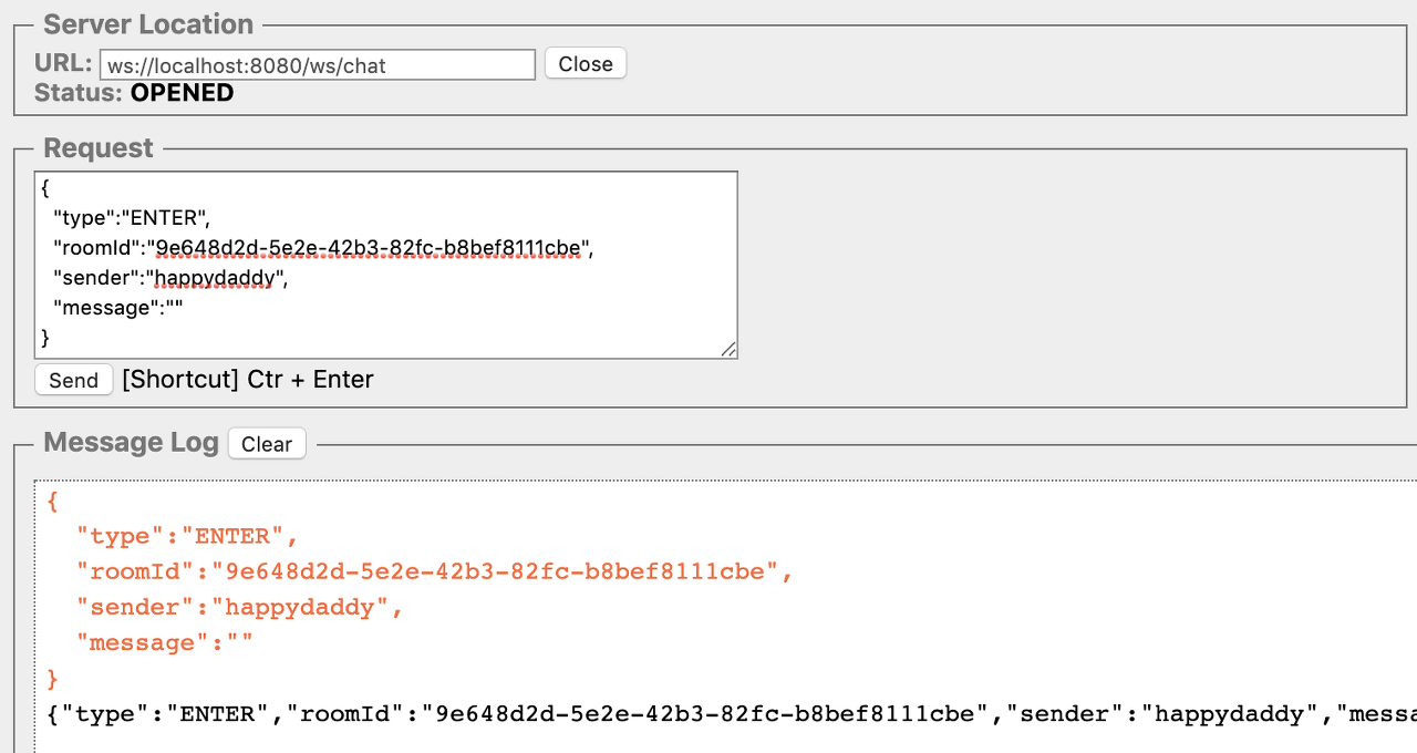 { "type":"ENTER", "roomId":"9e648d2d-5e2e-42b3-82fc-b8bef8111cbe", "sender":"happydaddy", "message":"" } |