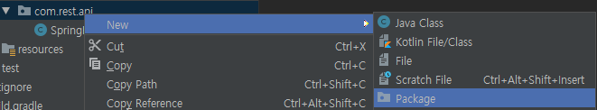 src/main/java 에서 메뉴를 호출하여 New – Package를 실행하고 com.rest.api package를 생성합니다. 그리고 com.rest.api 하단에 boot실행을 위한 Applications 설정 파일을 생성합니다.
