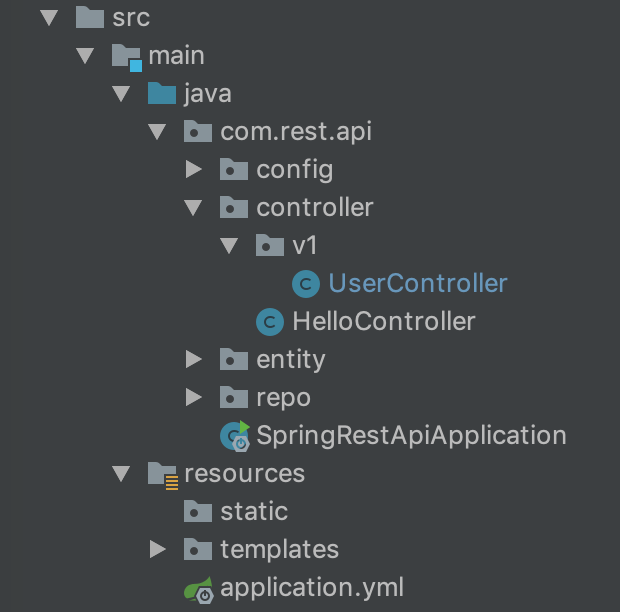 Jpa Repo를 사용하는 Controller를 하나 생성합니다. com.rest.api.controller 하위에 다음과 같이 v1 package를 만들고 UserController를 생성합니다.