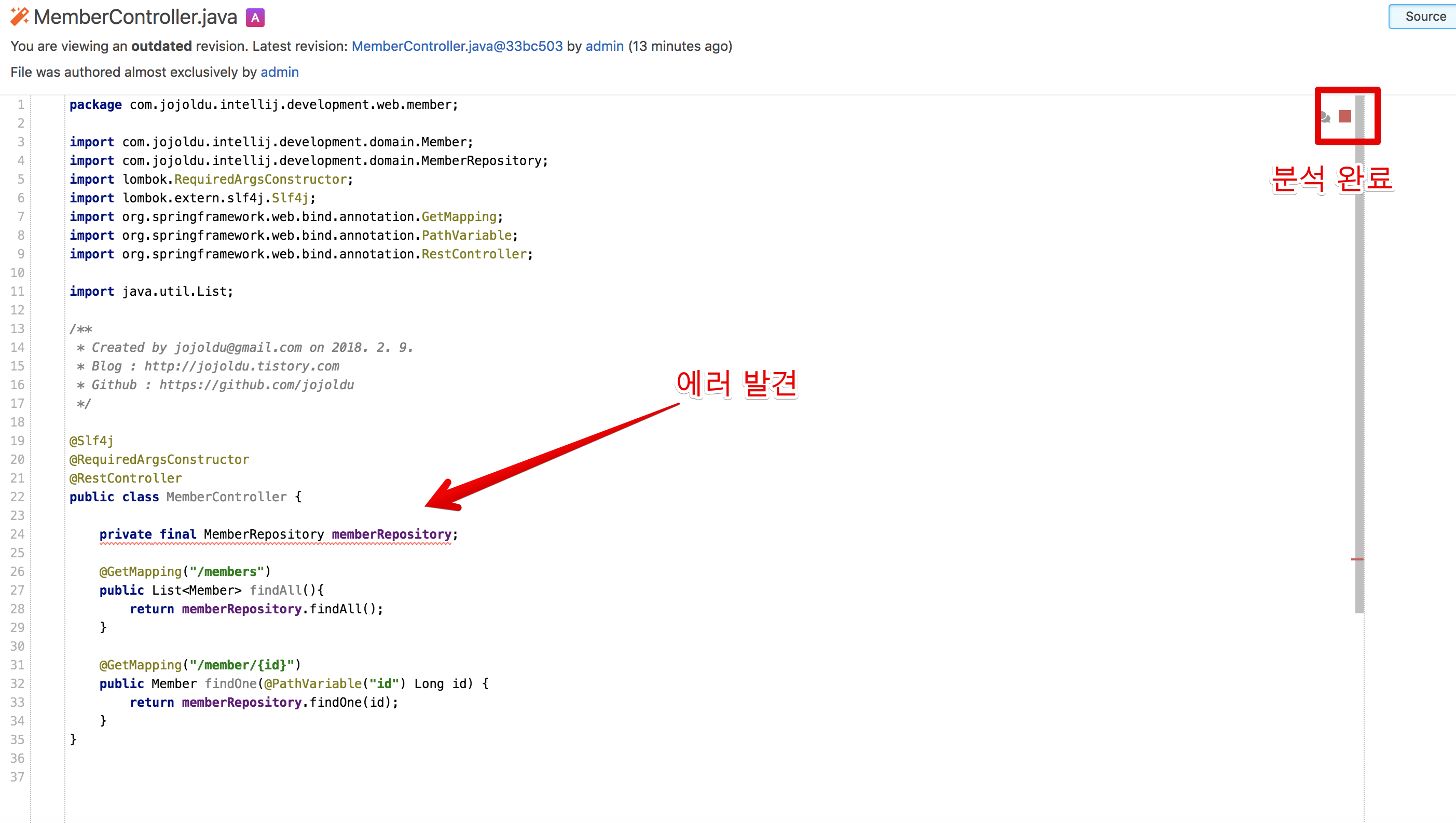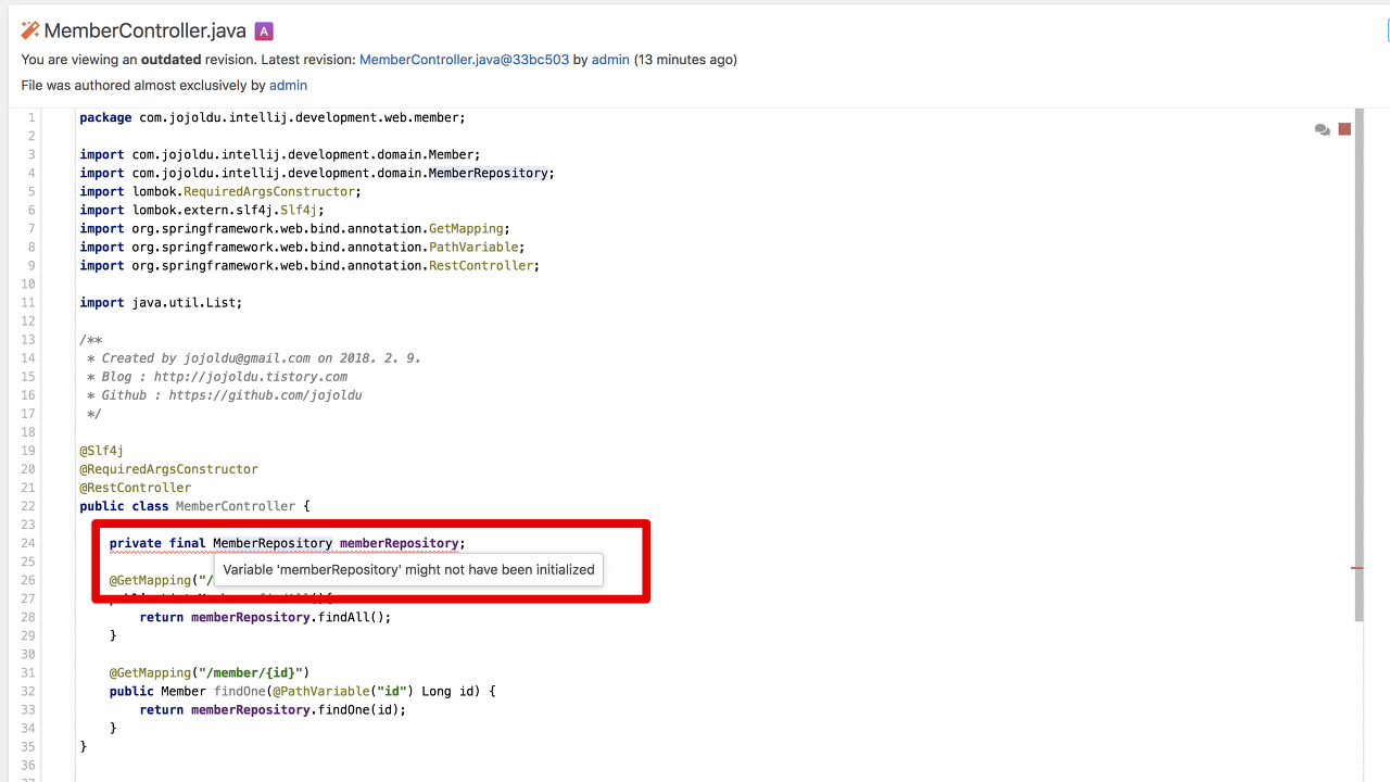 여기서 MemberRepository에 마우스 포커스를 두시면 왜 문제가 있는지 알려줍니다.