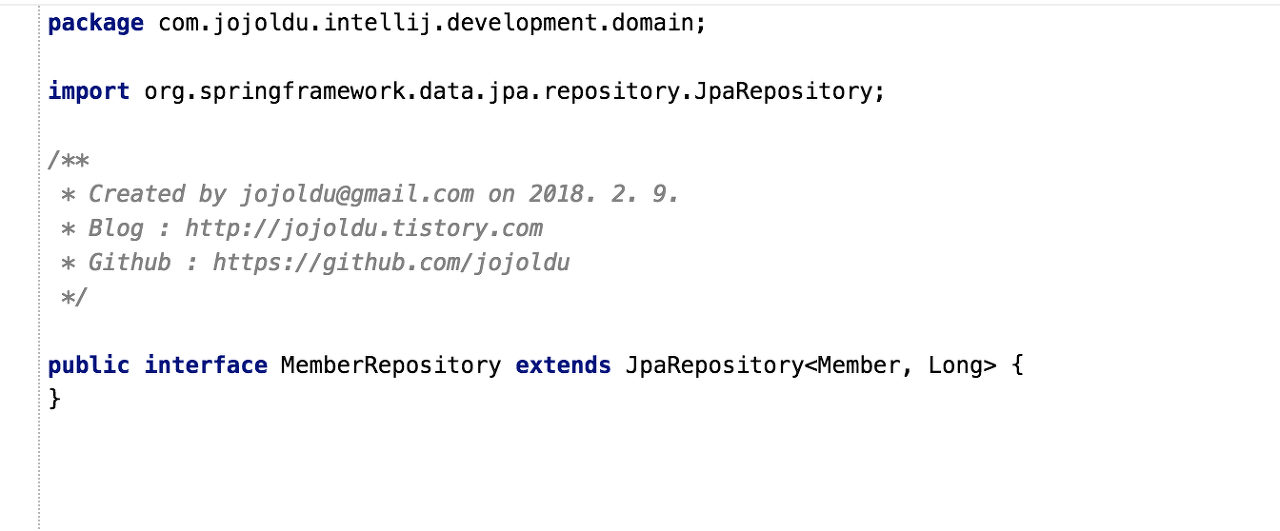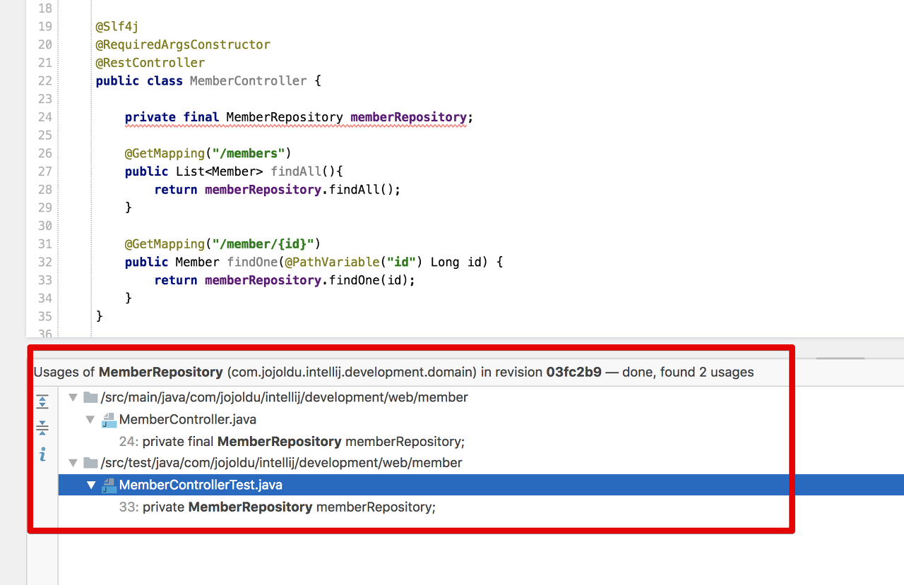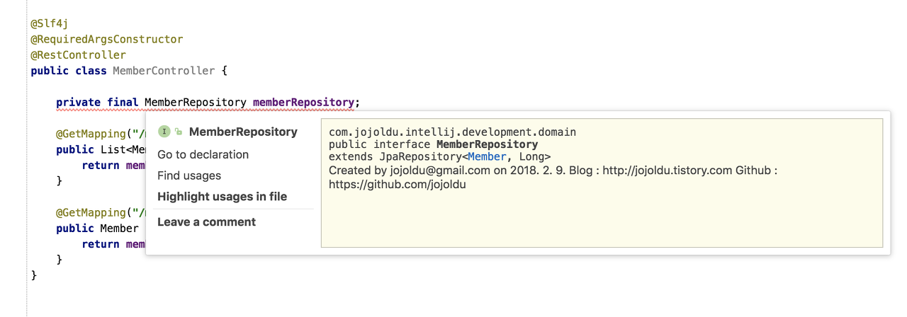 그리고 MemberRepository를 클릭해보시면 다양한 Code Intelligence 기능을 볼 수 있습니다.