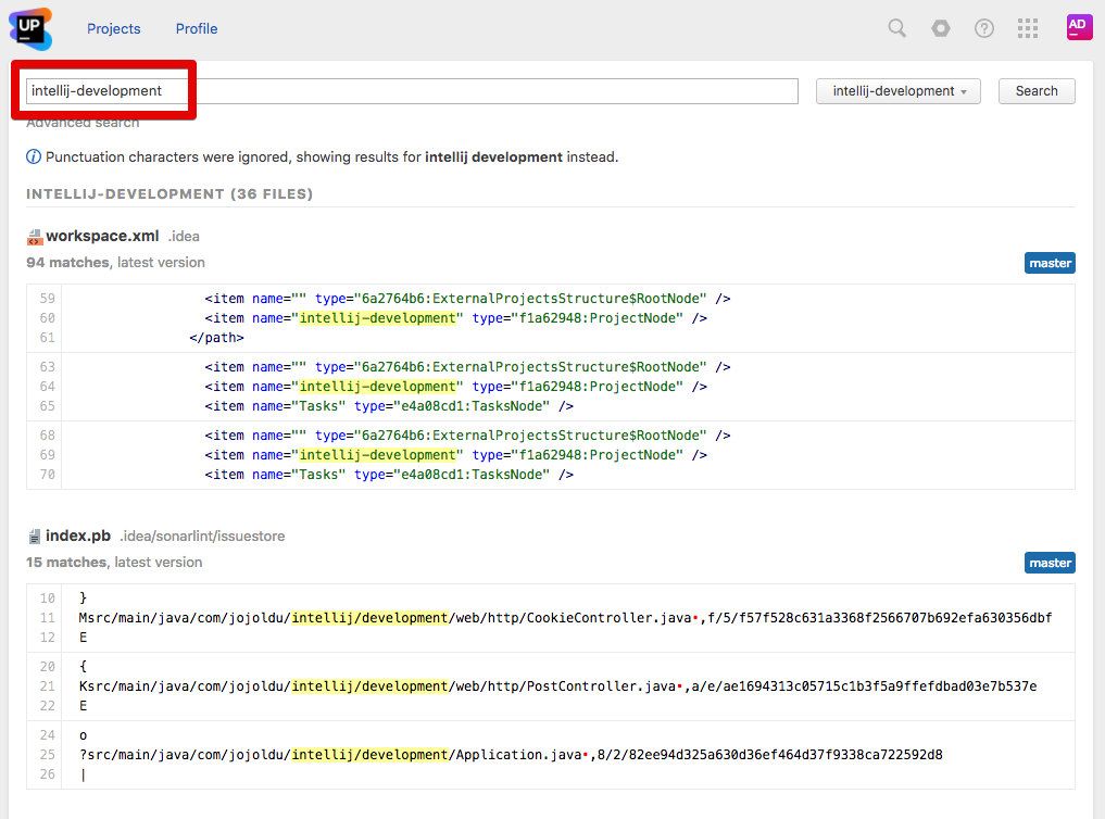 Upsource는 Github 보다 훨씬 파워풀한 검색 기능을 지원합니다.