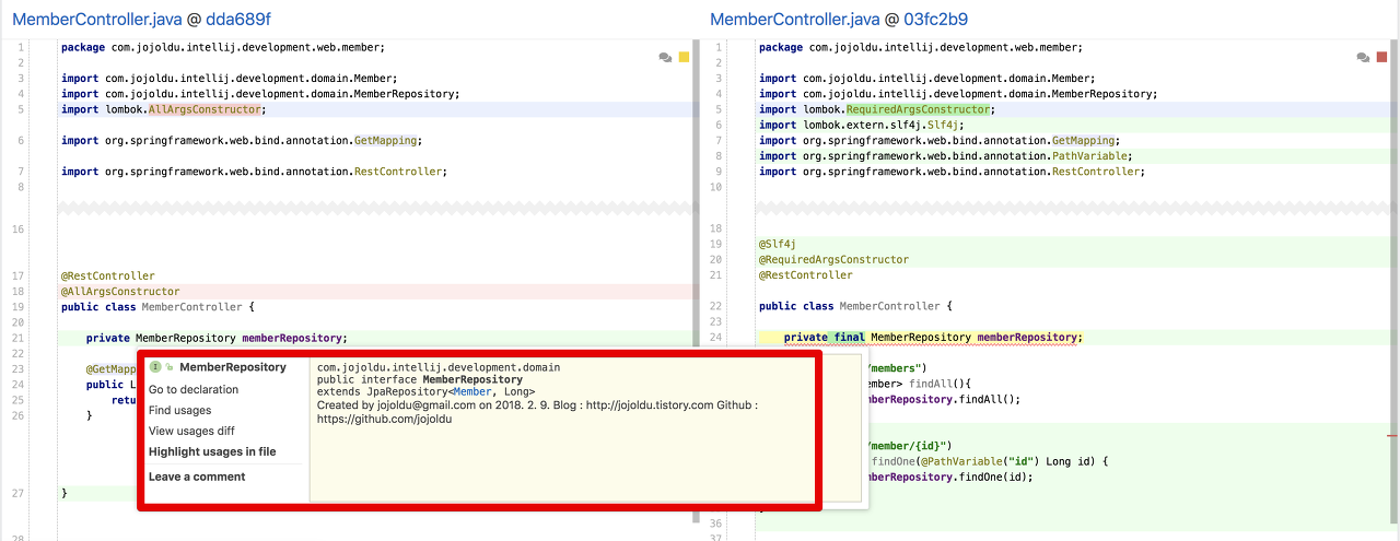물론 이렇게 diff 페이지에서도 Code inspection과 Code intelligence가 지원됩니다.