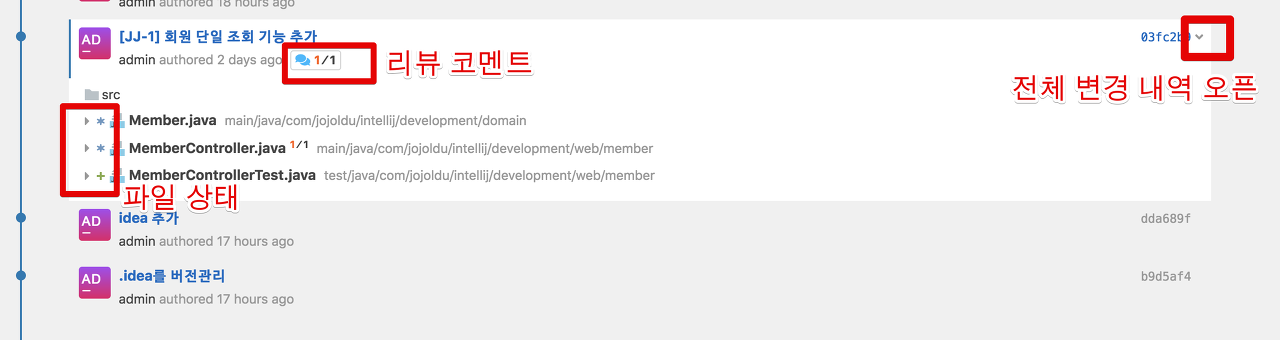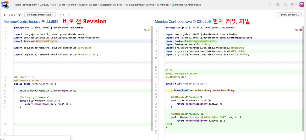 여기서는 Member.java와 MemberController.java는 변경을, MemberControllerTest.java는 새로 생성되었음을 알 수 있습니다.