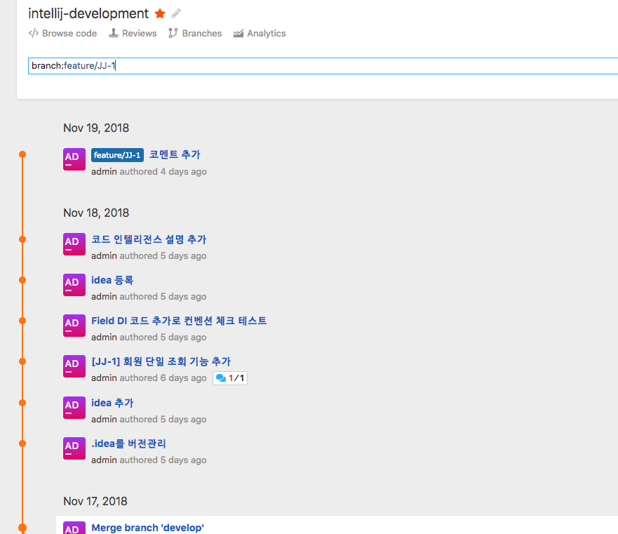그러면 디음과 같이 해당 브랜치 내역만 프로젝트 페이지에 노출됩니다.