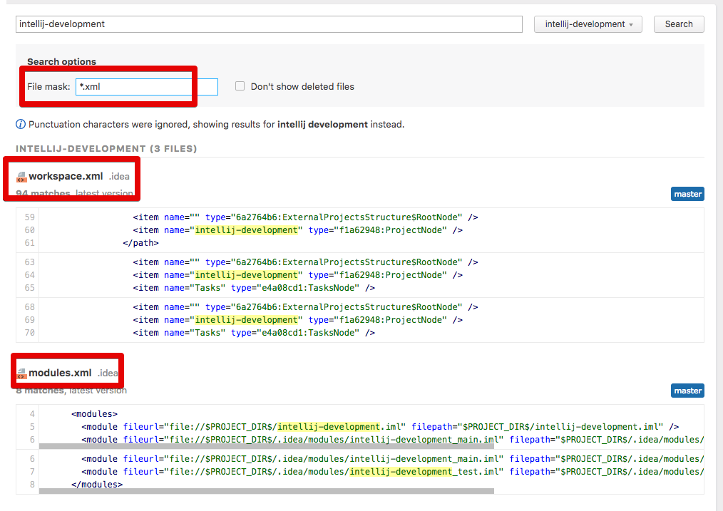 아래와 같이 *.xml로 검색하시면 xml 파일들 내에서만 검색을 해줍니다.