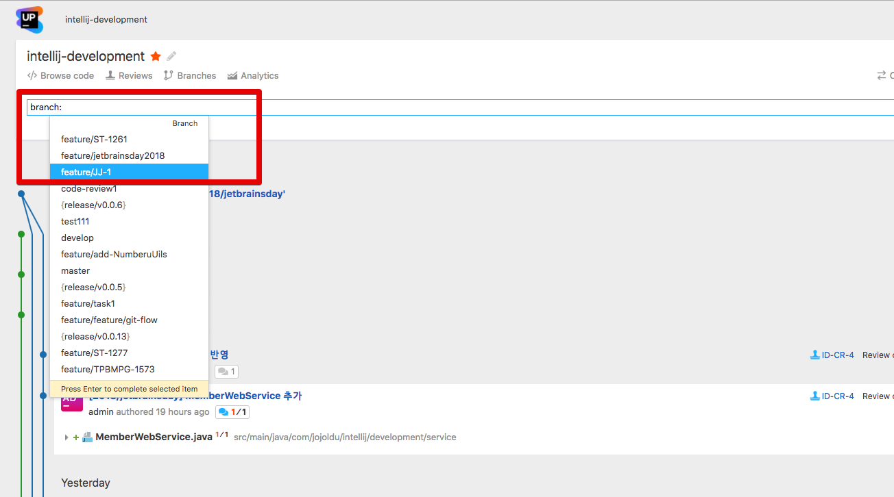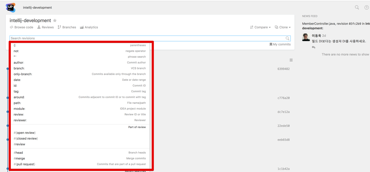 예를 들어 다음과 같이 포커스 창에 branch: 를 입력하시면 모든 브랜치 목록이 추천됩니다.