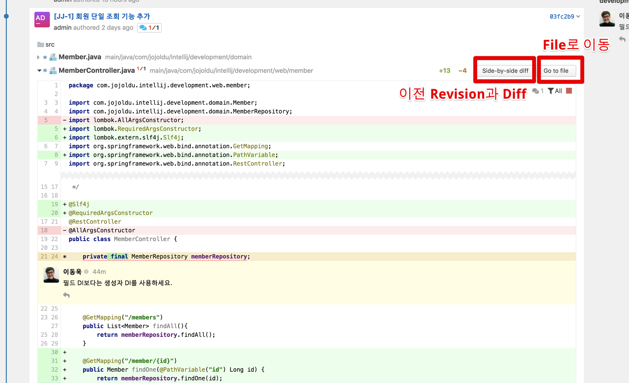 각 파일에 있는 화살표 버튼을 클릭 해보시면 해당 파일의 변경내역 역시 바로 확인할 수 있습니다.