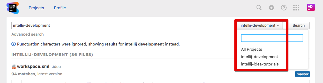 아래와 같이 검색창 우측에 있는 프로젝트 Select Box를 클릭하시면 프로젝트별 결과가 출력 됩니다.