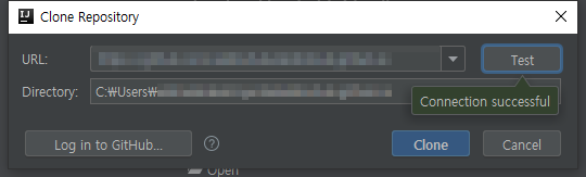 자신의 저장소 주소를 넣어서 Test 해보세요. 초록색 레이어와 함께 successful 이라는 문구가 나오면 정상적으로 연결된겁니다.